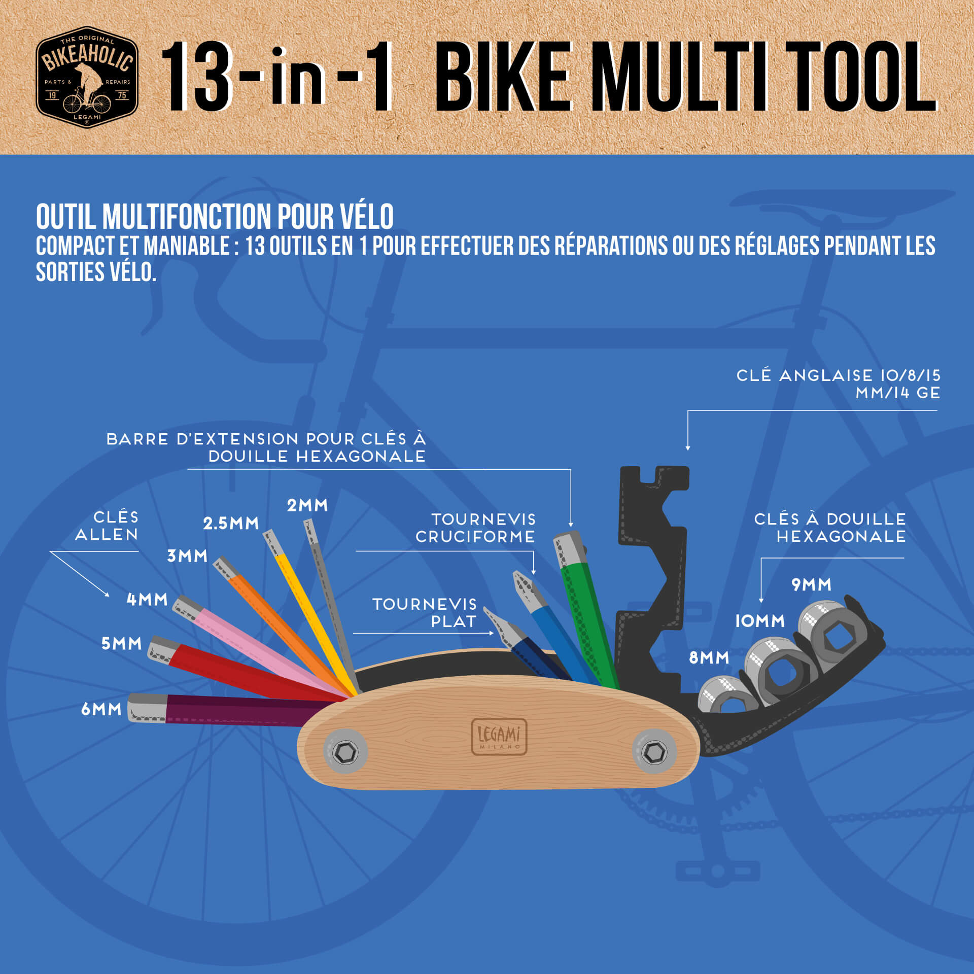 13 outils en 1 réparations et réglages vélo – Multicolore