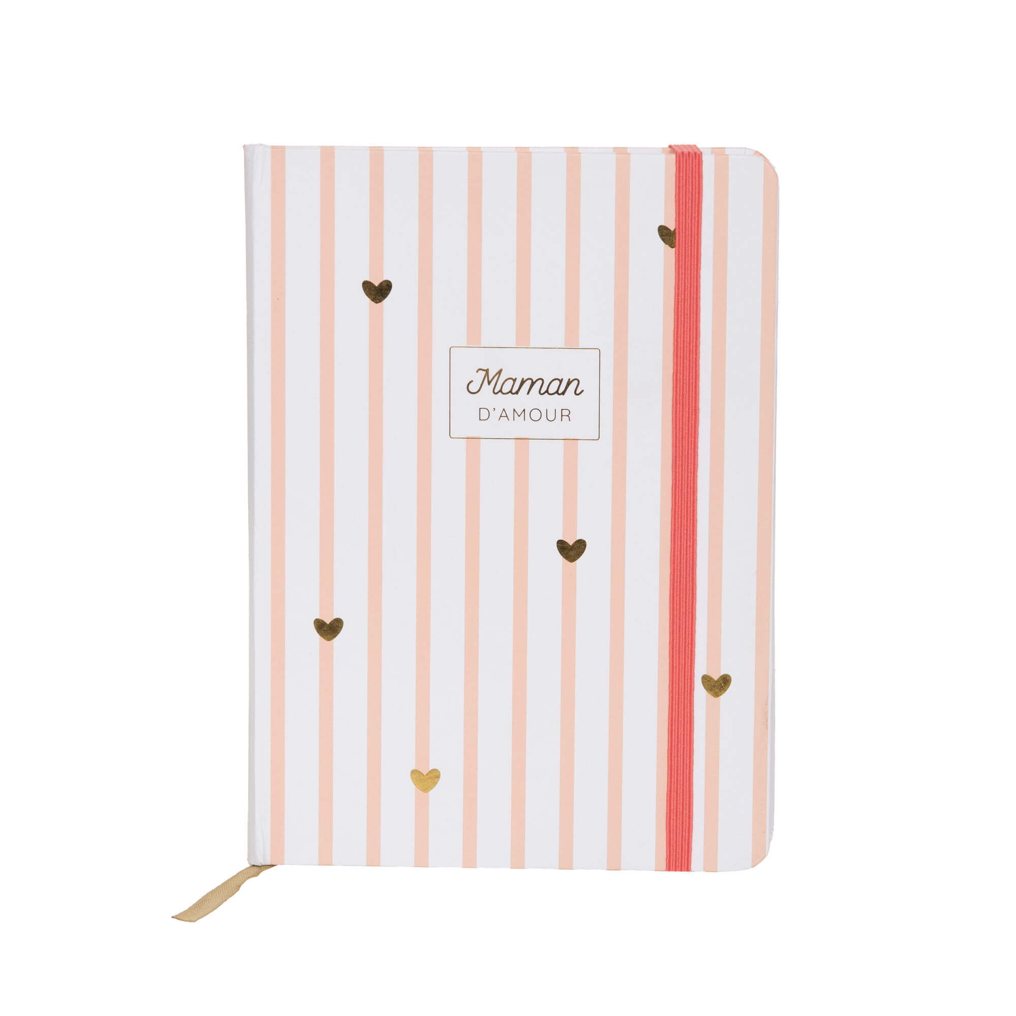 Carnet rayé corail coeurs dorés – Maman d’amour