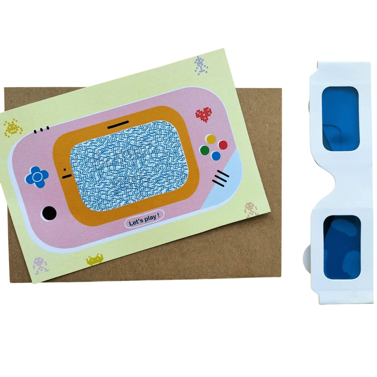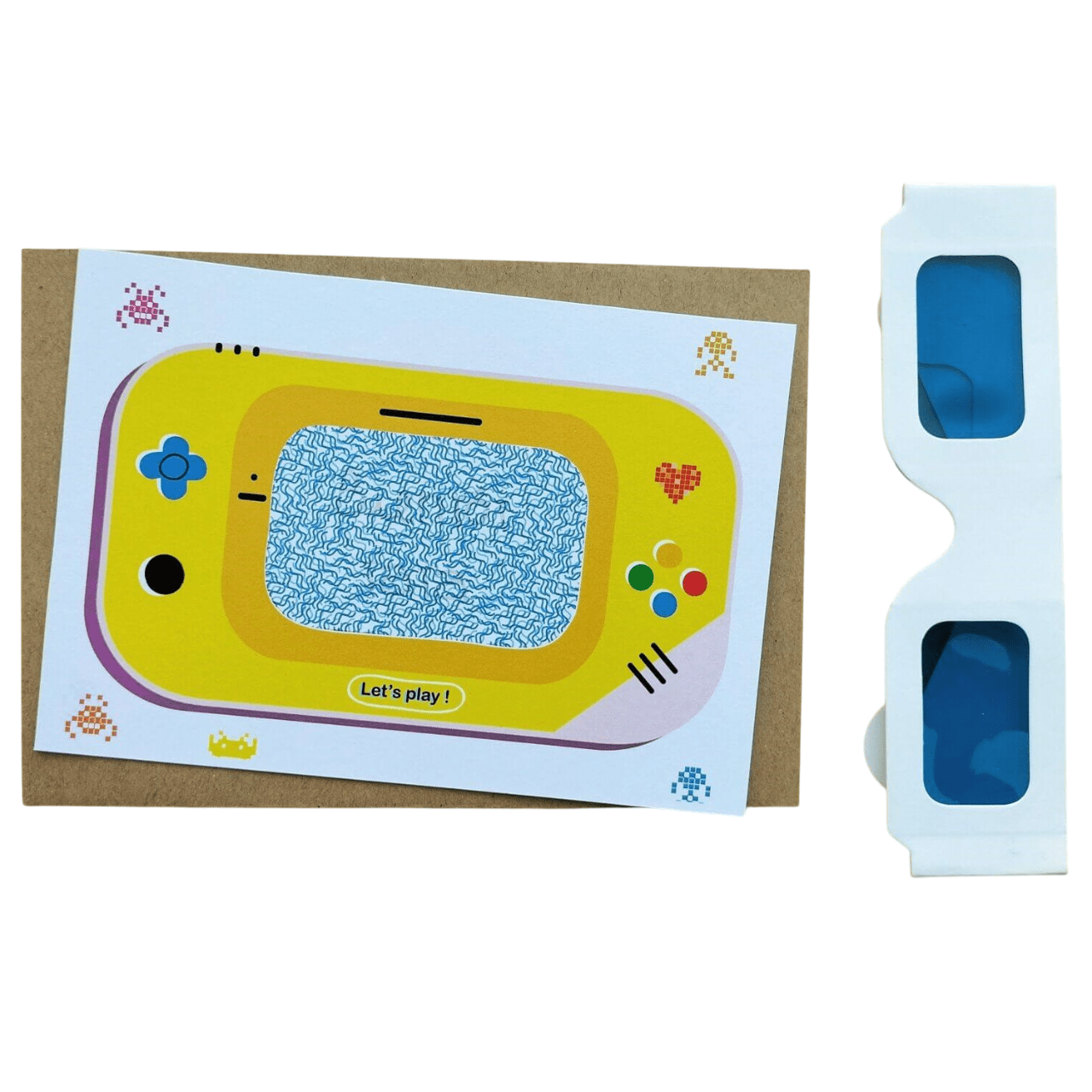 La carte jeu est dotée d’un message secret révélé uniquement avec des lunettes filtres bleues ou roses (fournies).
