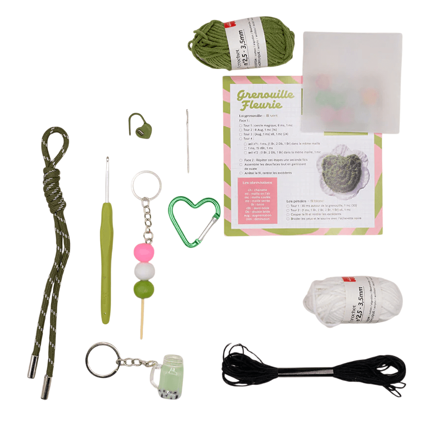 Que contient le coffret ? 2 pelotes de coton 10 g (vert et blanc), 1 échevette noire, 2 accroches porte-clefs avec chaînette, Ouate de rembourrage, 1 cordelette verte/blanche, 1 mousqueton cœur, 1 mix de perles colorées