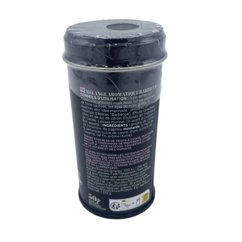 Composition: Poudre de cumin, de coriandre, de paprika, moutarde, poivre de la Jamaïque, sucre de canne, thym, piment de Cayenne, sel fin, arôme (fumé).