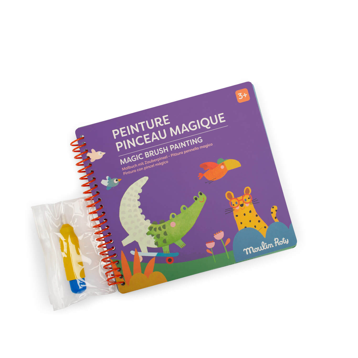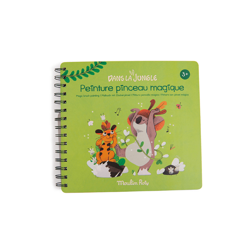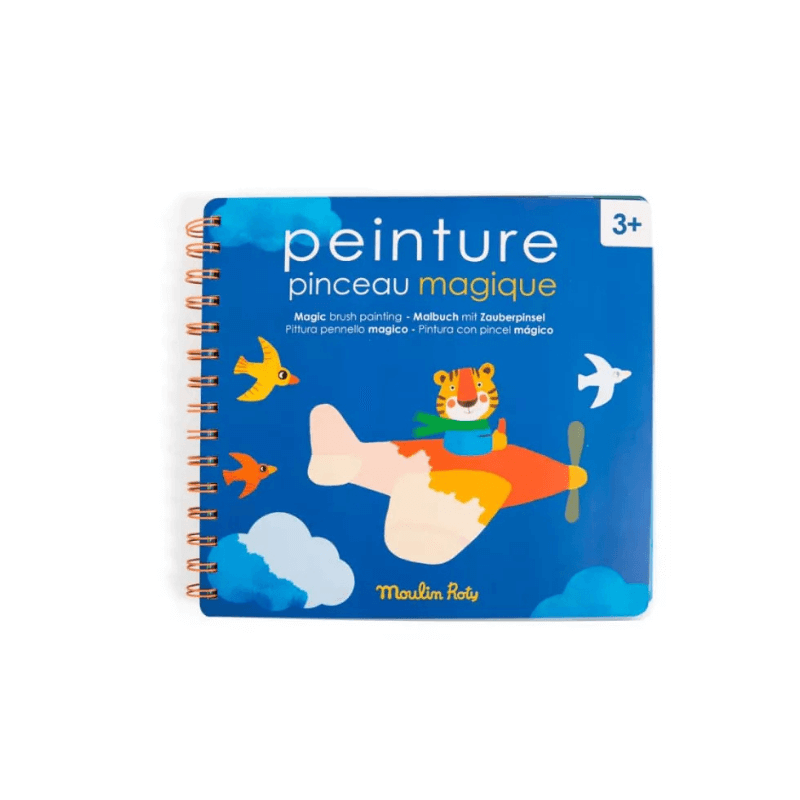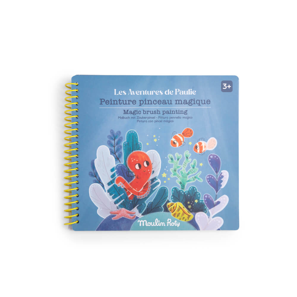 Grâce à un pinceau magique avec réservoir d’eau, peignez les zones blanches sur chaque page pour faire apparaître comme par magie les illustrations !